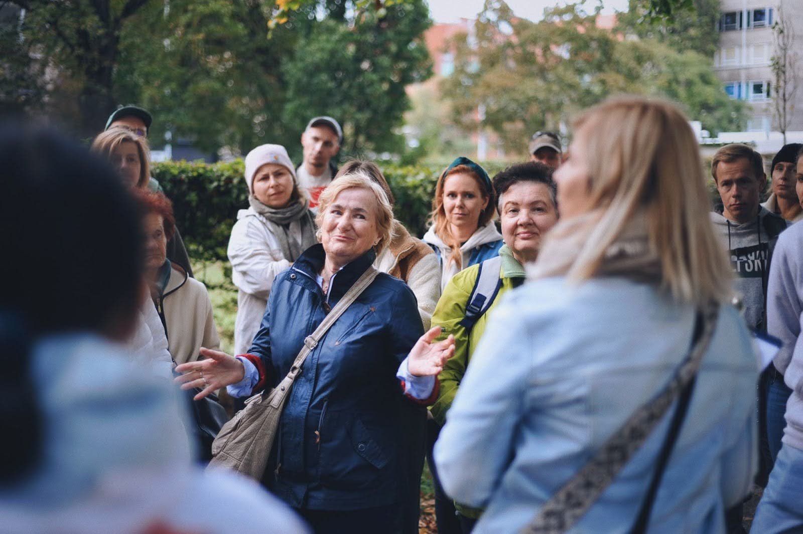 Skąd pomysł na takie działanie? Wszystko zaczęło się od jednego z osiedlowych spacerów dwa lata temu. Podczas wspólnego zwiedzania jednej z głównych ulic Grunwaldu okazało się, że studenci i studentki uczestniczący w wydarzeniu nie wiedzieli o tym, że w okresie oblężenia Breslau dzisiejsza oś Grunwaldzka stała się pasem startowym dla samolotów z zaopatrzeniem dla niemieckiej armii. Nasza przewodniczka zaczęła więc opowiadać o masowych wyburzeniach wokół Kaiserstrasse, kilkunastu tysiącach ofiar poległych podczas prac związanych z porządkowaniem terenu pod lotnisko, a także o tragicznych warunkach życia w Festung Breslau. Jak się okazało, dla wielu osób z młodszego pokolenia fakty te były zupełną nowością. Z kolei seniorki i seniorzy mieszkający na osiedlu od urodzenia temat „wielkiej pustki” po wyburzeniach wokół dzisiejszej osi Grunwaldzkiej traktują jako punkt wyjścia do snucia wspomnień, wyciągania archiwalnych fotografii i opowiadania o tym jak na osiedlu żyło się w czasach ich młodości. W naszym zespole poczuliśmy, że musimy ten wątek złapać i stworzyć wokół niego program działań, które umożliwią nam utrwalenie tych wspomnień, pogłębienie naszej wiedzy o przeszłości osiedla i popularyzację tej wiedzy wśród młodszych pokoleń.