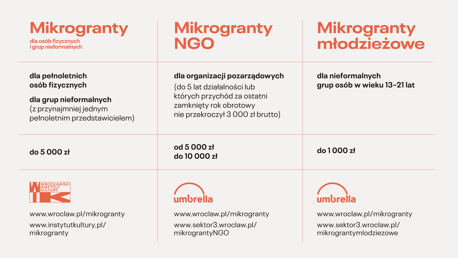i koordynatorkami zespołów Wrocławskiego Instytutu Kultury i Fundacji Umbrella. Na początku września odbędą się również specjalne warsztaty i szkolenia poświęcone każdej ze ścieżek. Zajęcia nie tylko umożliwią bliższe zapoznanie się z zasadami programu, a także pomogą lepiej poznać wymagania i formularz wniosku, który wypełniany jest przy zgłoszeniu projektu. Dokładne terminy szkoleń oraz przydatne dokumenty można znaleźć na stronach poszczególnych ścieżek: