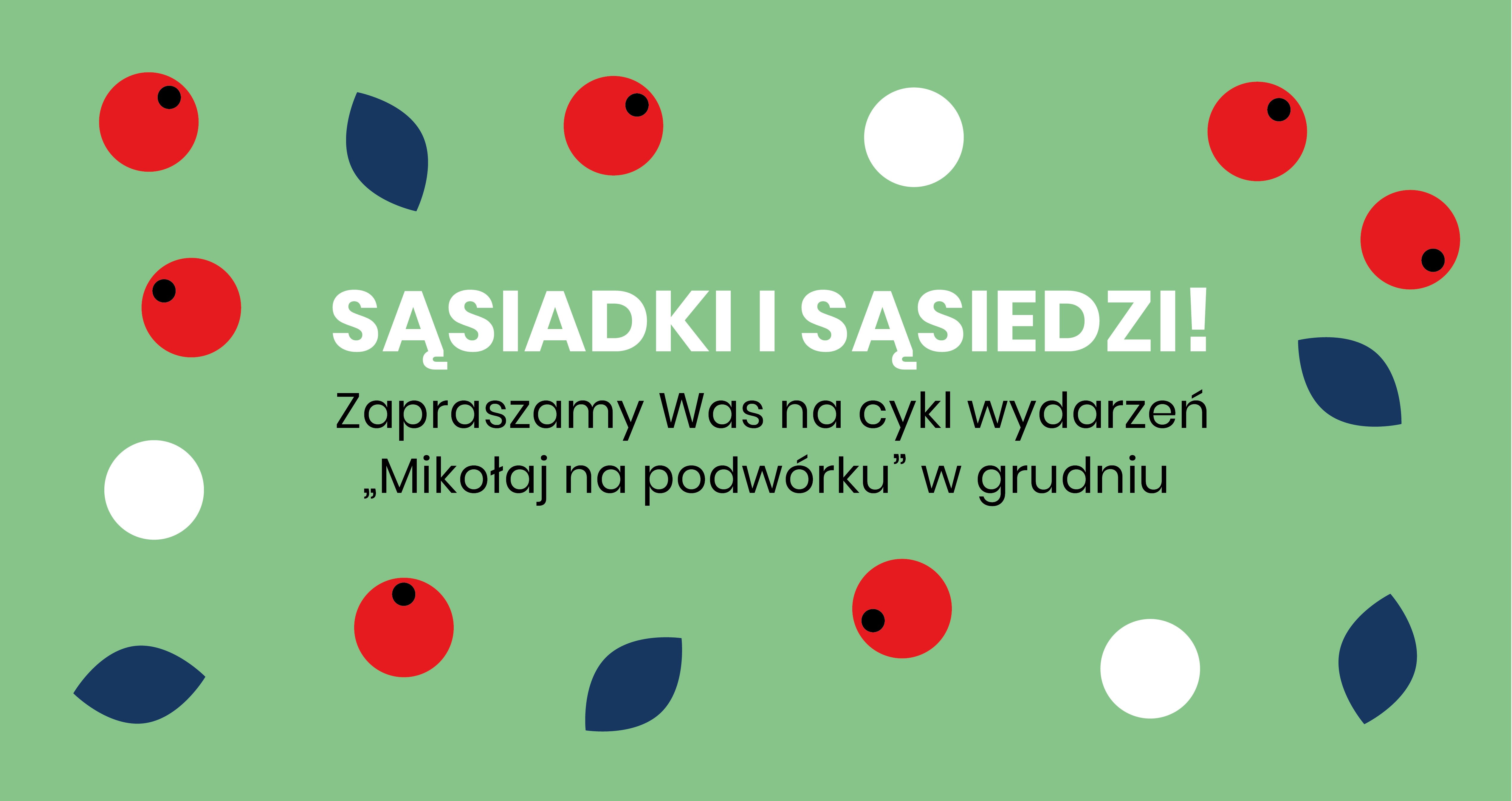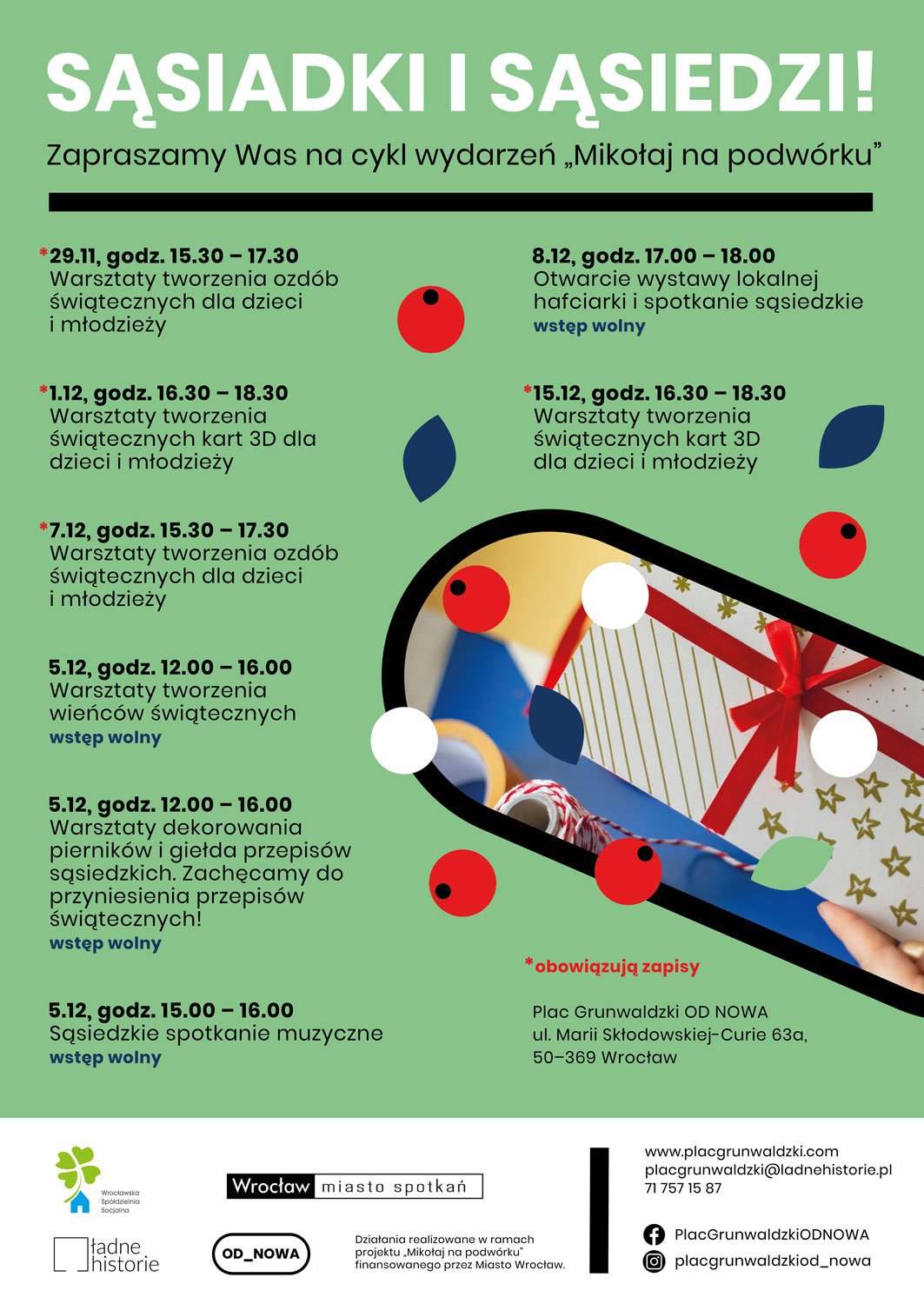 Wspólnie z Wrocławską Spółdzielnią Socjalną zapraszamy na cykl wydarzeń „Mikołaj na podwórku”, w ramach których odbędą się warsztaty plastyczne dla dzieci i młodzieży, międzypokoleniowe warsztaty ze zdobienia pierników i tworzenia ekologicznych wieńców świątecznych, giełda przepisów sąsiedzkich, spotkanie muzyczne oraz wystawa dzieł lokalnej hafciarki.