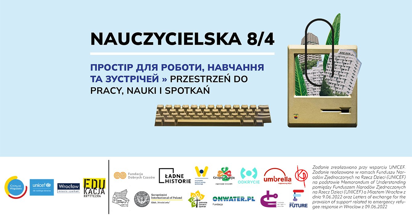 Ми відкриті для нових ідей, проєктів та ініціатив, адресованих людям з України, котрі живуть у Вроцлаві. Якщо вам потрібен простір у центрі міста, щоб організувати у ньому якийсь захід, повідомте нам свою ідею та концепцію, заповнивши цю форму! https://bit.ly/N84_NOWEINICJATYWY.