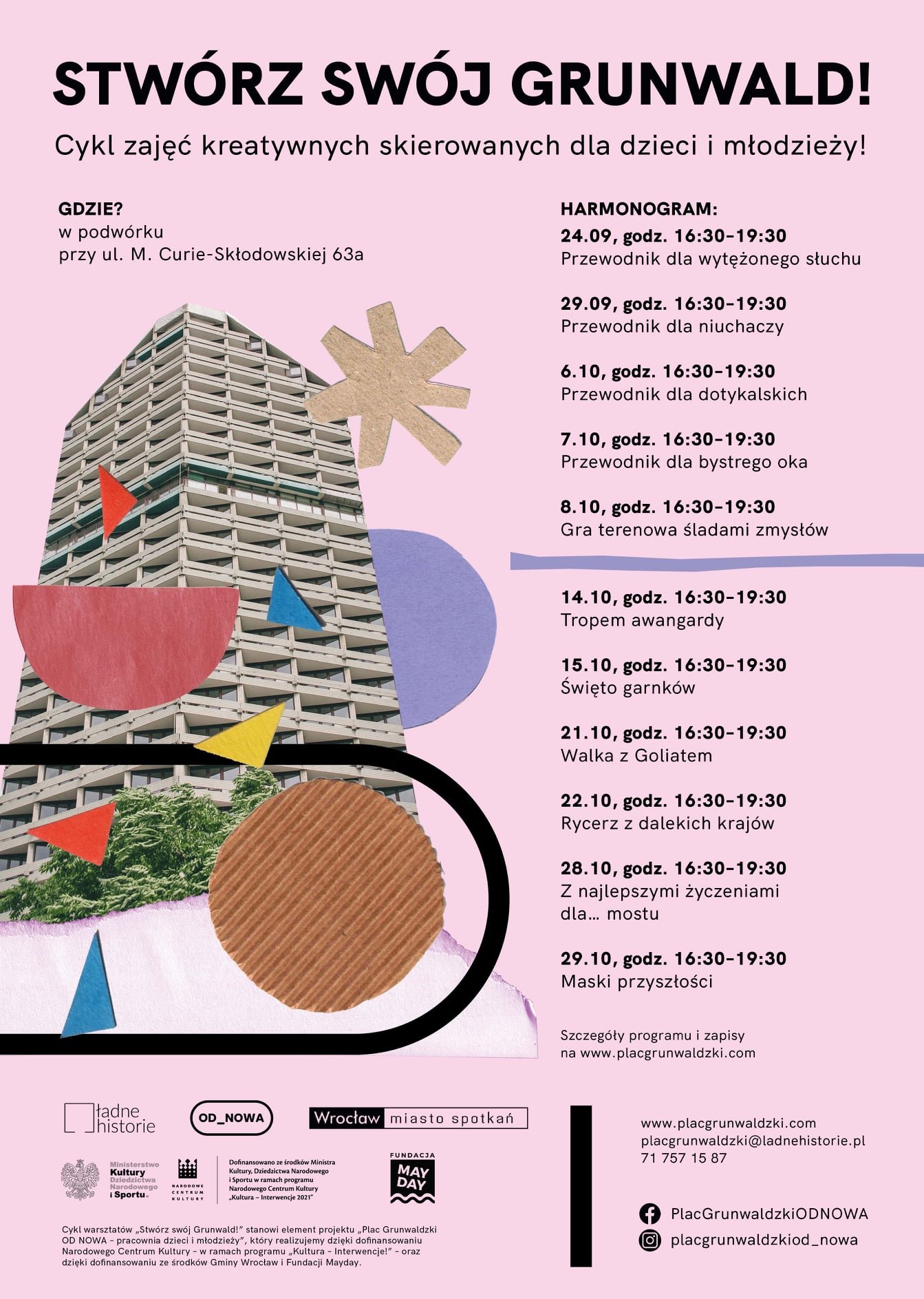 Cykl jedenastu kreatywnych zajęć animacyjno-warsztatowych stanowi kontynuację i rozwinięcie naszych działań edukacyjnych, które adresujemy do najmłodszych mieszkanek i mieszkańców osiedla Plac Grunwaldzki. Podczas zajęć we wrześniu i październiku uczestnicy i uczestniczki dowiedzą się, jak zmieniał się Plac Grunwaldzki w ciągu ostatnich sześciu dekad oraz jakie elementy były charakterystyczne dla konkretnego dziesięciolecia. Wspólnie zajrzymy, co kryje przeszłość. Inspirując się ciekawymi zdarzeniami, postaramy się je przywrócić ponownie do życia – chociaż na krótki moment. Naszym celem jest uwrażliwienie dzieci na ich otoczenie oraz umożliwienie im twórczej wizualizacji pomysłów na poprawę jakości osiedla, w którym żyją. Chcemy pokazać im, że mogą mieć wpływ na to jak wygląda ich najbliższa przestrzeń i zbudować w nich poczucie odpowiedzialności za nią.