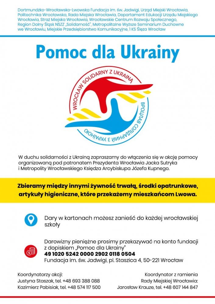 Szkoła organizuje zbiórkę darów rzeczowych, a od 7 marca w godzinach 14:00 - 16:00 zaprasza do świetlicy szkolnej dzieci z Ukrainy, które przyjechały w ostatnich dniach do Wrocławia. Na miejscu obecny będzie wychowawcą mówiący w języku ukraińskim. Zgłoszenia prosimy kierować je na adres: emilialorek@tlen.pl